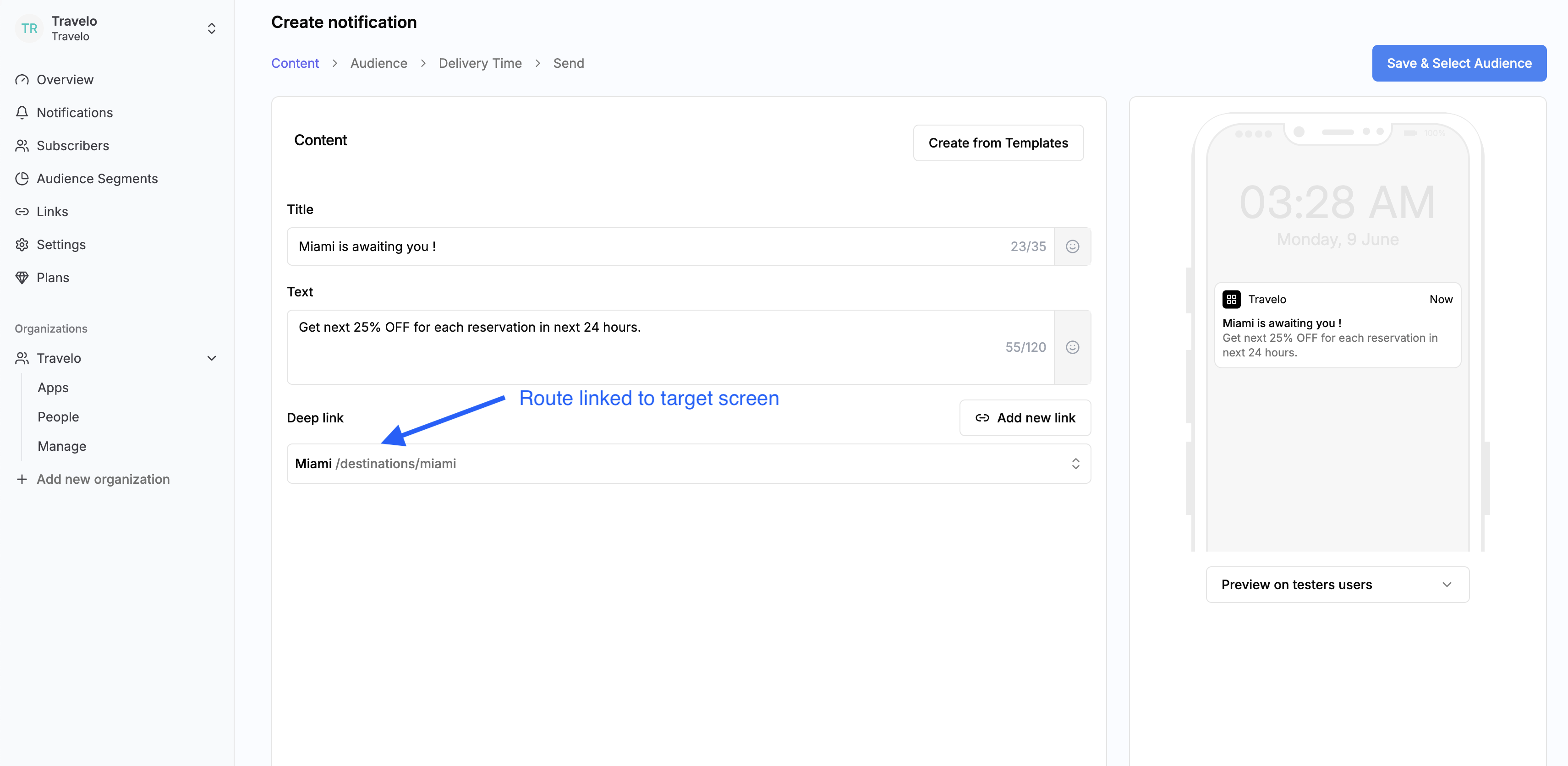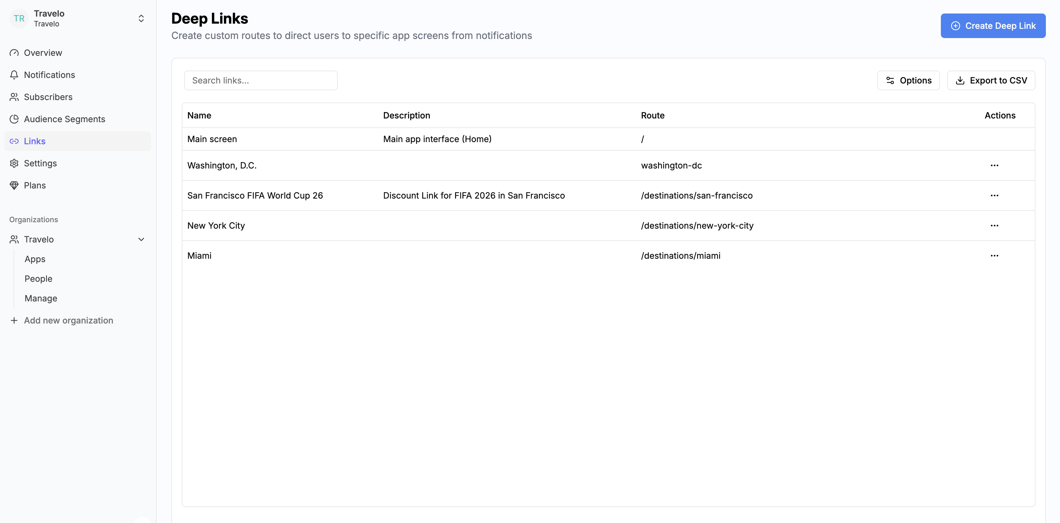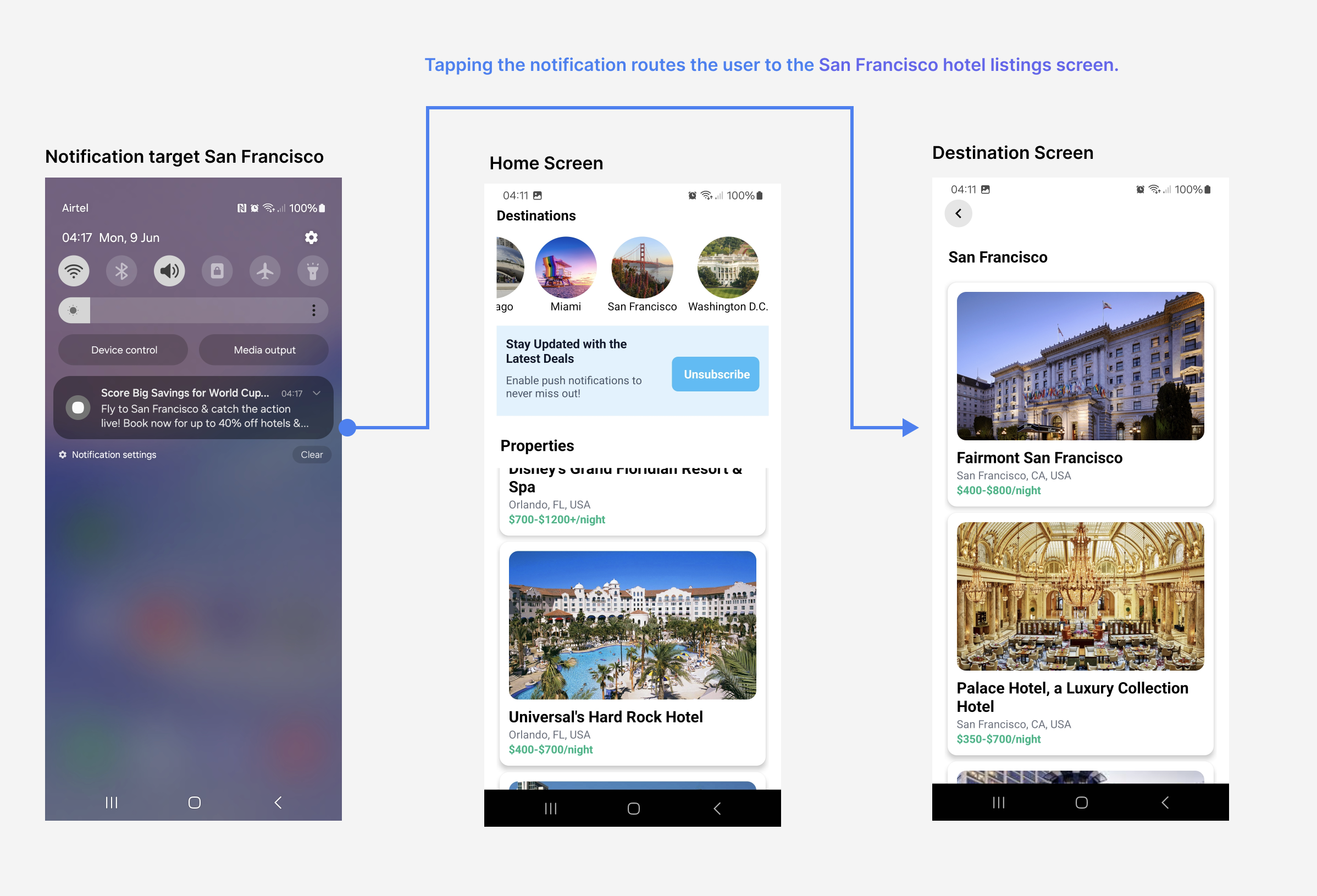 A deep link to a specific destination screen should follow this format:destinations/san-francisco- San Franciscodestinations/new-york-city- New York Citydestinations/miami- Miamidestinations/washington-dc- Washington DC